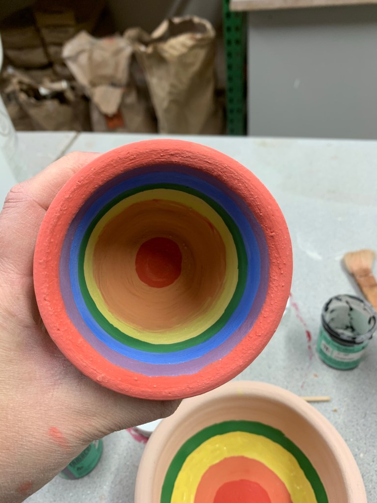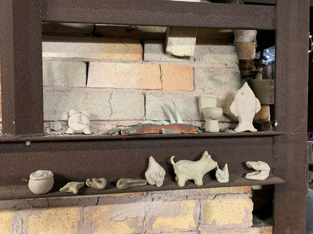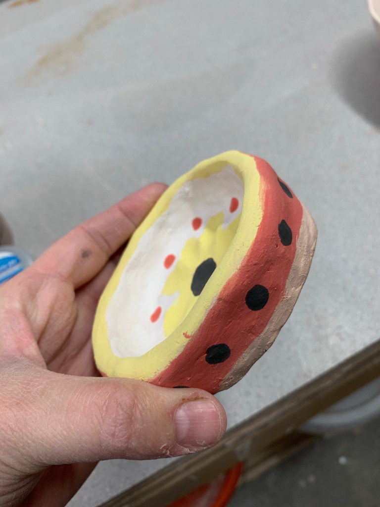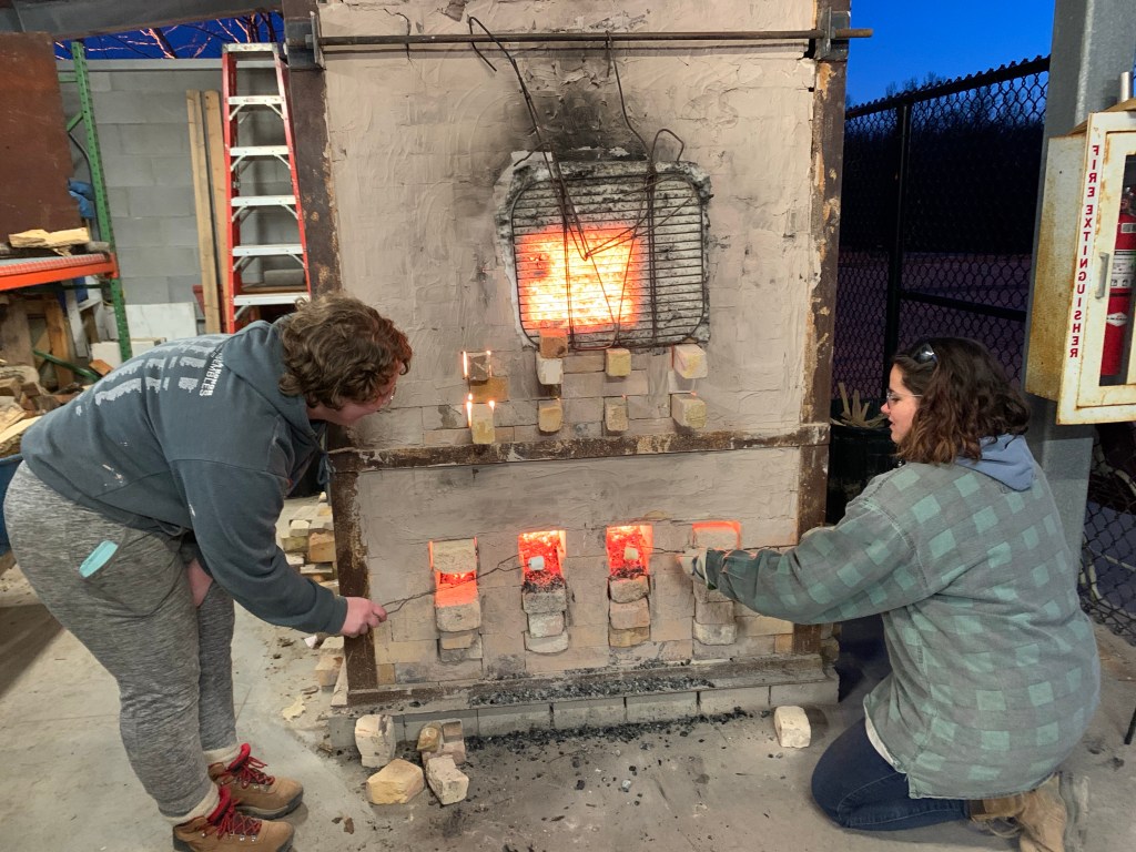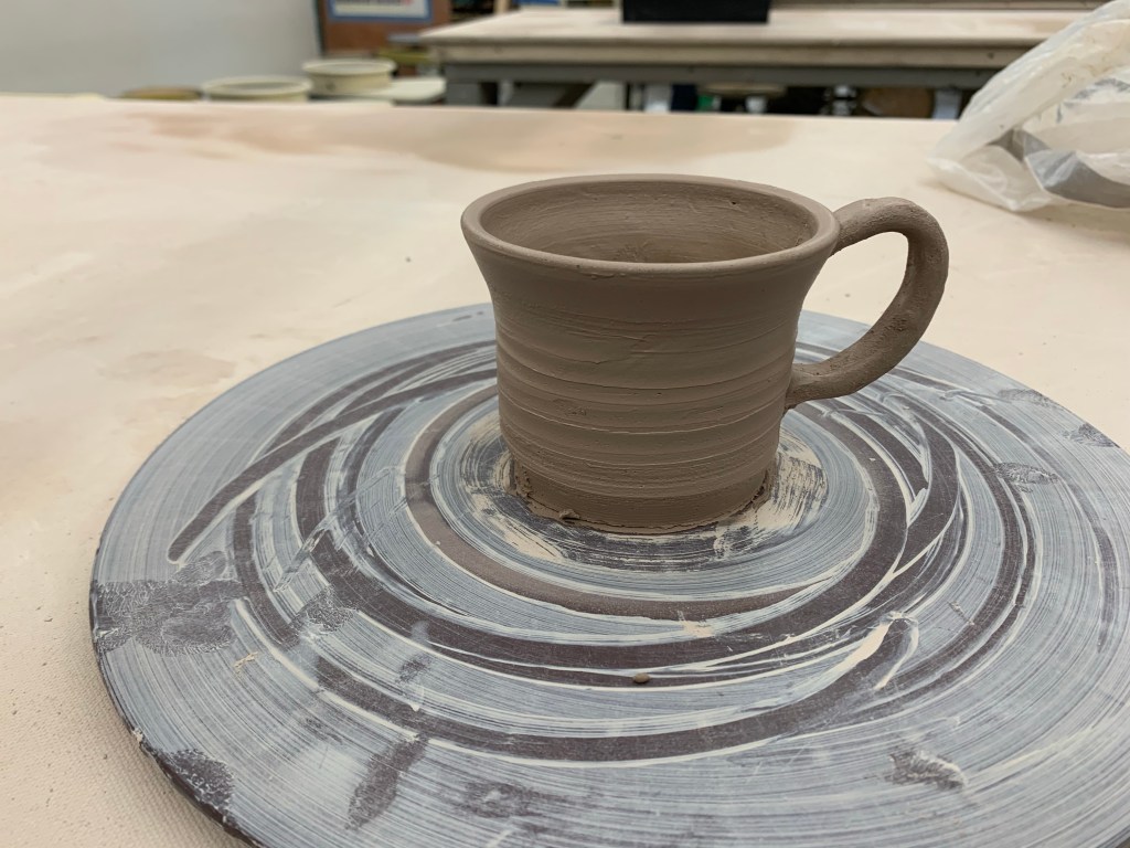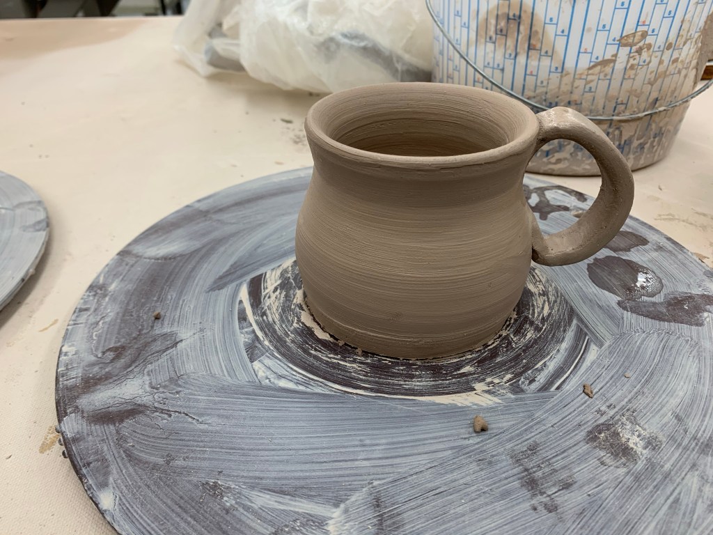 This week I continued to work on my mug project. I continued to experiment with different mug sizes and styles as well as different styles of handles. I also prepared a few pieces to put in the wood kiln which we began firing on Thursday. I spent most of the class period on Wednesday, under glazing and glazing three pieces for the wood kiln. I decided I wanted to use bright underglaze colors for the inside of the cup and mug and use clear glaze only on the outside. I am hoping the wood firing creates interesting effects on the outside of the pieces. I also added a tiny bowl like dish that I underglazed as well. I’m hoping all of my pieces survived the firing. I was very excited to help during the firing. On Thursday night I worked the 8p-12a shift and spent that shift learning the ropes. We added wood every few minutes but only to the front bottom of the kiln. I came back Friday morning for the 8a-12p shift and spent most of the morning trying to keep a close eye on the wind direction of the smoke we were creating. At this point we had begun loading wood in the sides and front opening of the kiln. I came back to help out at the 4am-8am shift on Saturday morning. That was a very busy shift of constantly stoking the wood and restocking our wood buckets. I came back for one last shift later that day when I got off work. I got there around 2:30 and they were starting to wrap up the stoking. Once we did the final stoke we sealed up all opening with news paper dipped in door slip. The entire experience was really interesting and fun to be involved in. This is my last semester so I’m glad I got to be a part of this firing. I still have lots to do to complete my current project and will begin the under glazing on Monday.